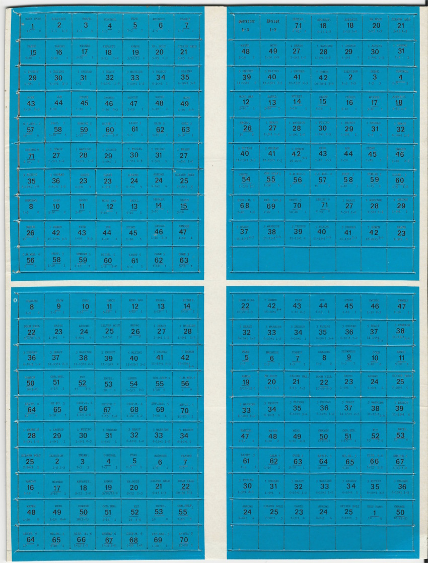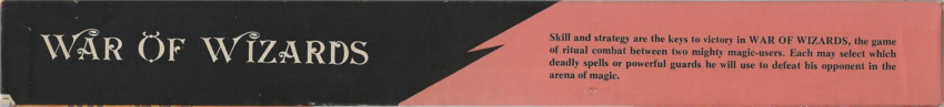 This version was similar to the 2nd Printing but came in an unattractive dark box. The game board is slightly different, with the words “War of Wizards” written across the center. This boxed version came with four 15mm metal figures of priests and magic users and also included a pair of 20-sided dice. The countersheet is die-punched, laid out a bit differently, and includes 18 blank counters. The rulebook is printed in an 8.5″ x 11″ booklet rather than the smaller, thicker booklet of the 2nd printing. The text of the rules is almost identical. The only differences are the addition of an annotated illustration of a counter and differently formatted reference tables, which in this version are part of the rulebook.