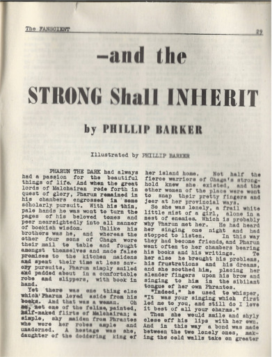 Barker actually only partly wrote “And the Strong Shall Inherit.”  The Editor states in the foreword to the issue that he tossed out Barker’s original ending and wrote a new one.  Nonetheless, it is this article that is the most interesting because it includes an illustration by Barker that has not, to my knowledge, been previously reproduced.