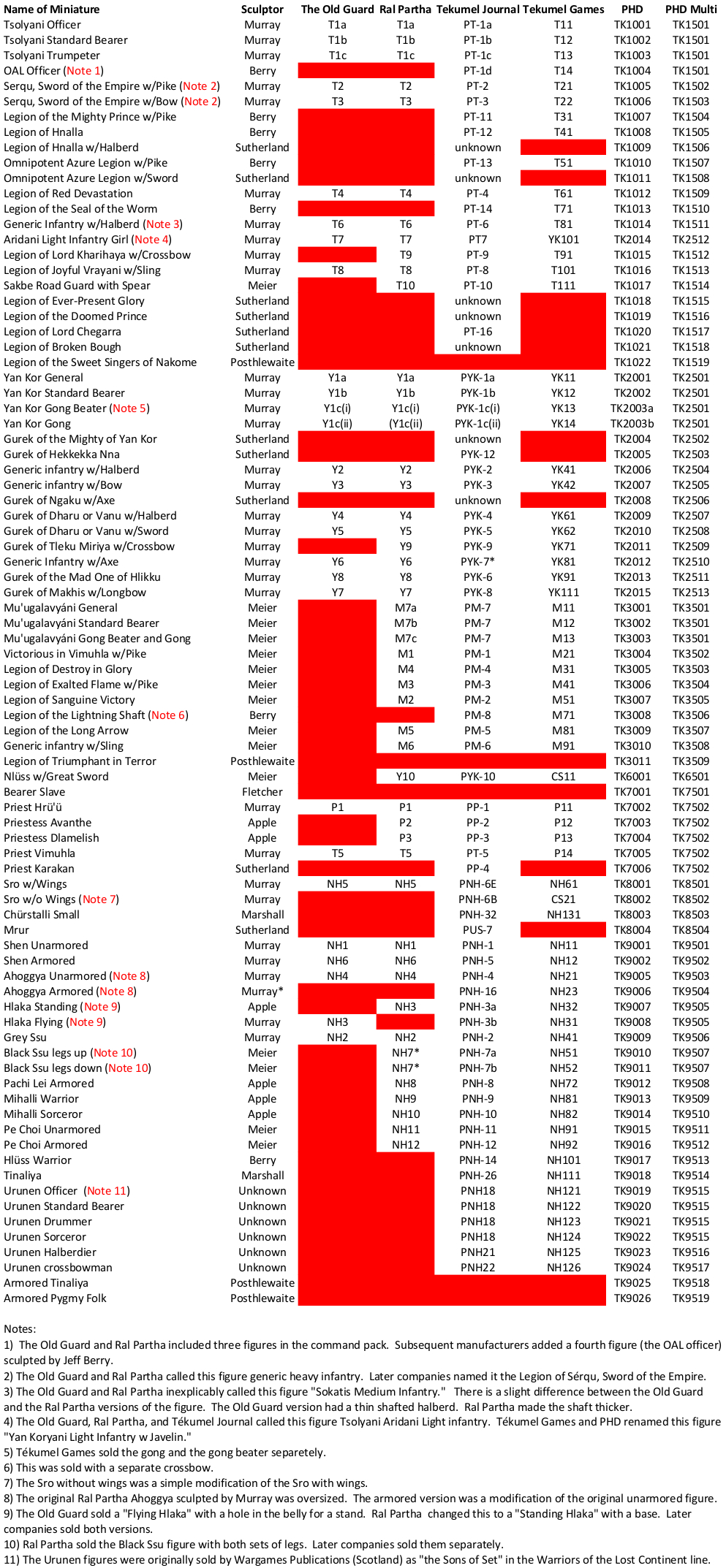 So, suppose you buy a 25mm Tékumel miniature. How can you tell which model it is and what company made it? Often miniatures are sold with bits of the original package but, failing that, the table at the end of the post and the photos in the above posts, especially the one on PHD, should be helpful in identifying the figure. As the notes to the table indicate, sometimes companies made small changes to the figures that can also help in identification (e.g. a “standing” Hlaka was not made by Old Guard).